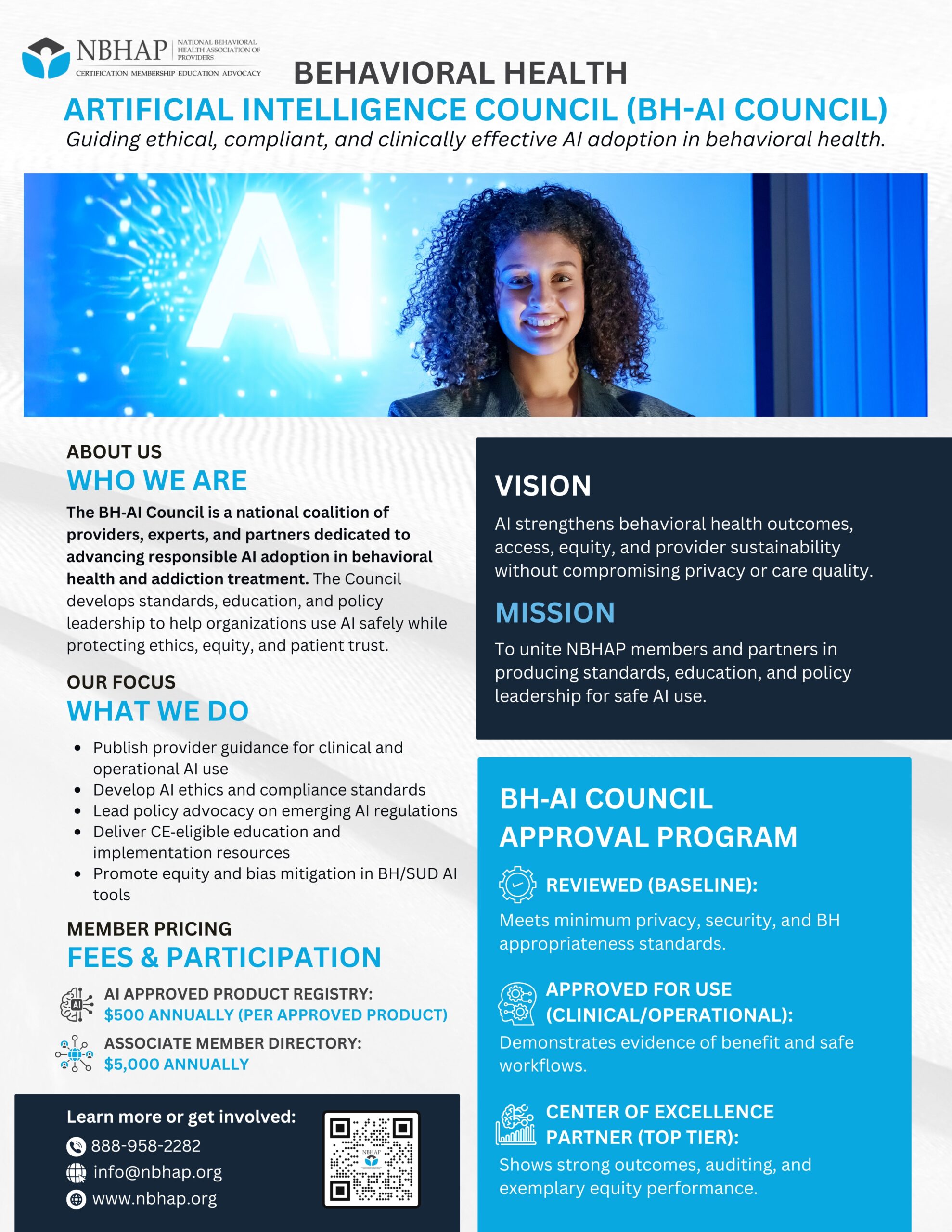 The BH-AI Council unites NBHAP members and partners in a coalition framework to produce standards, education, and policy leadership for safe AI use in behavioral health.