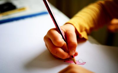 a small child's hand - white - with a colored pencil in it, wearing a yellow long-sleeve shirt