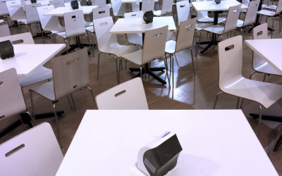 a bunch of white tables with white chairs around them, each with a speaker on it